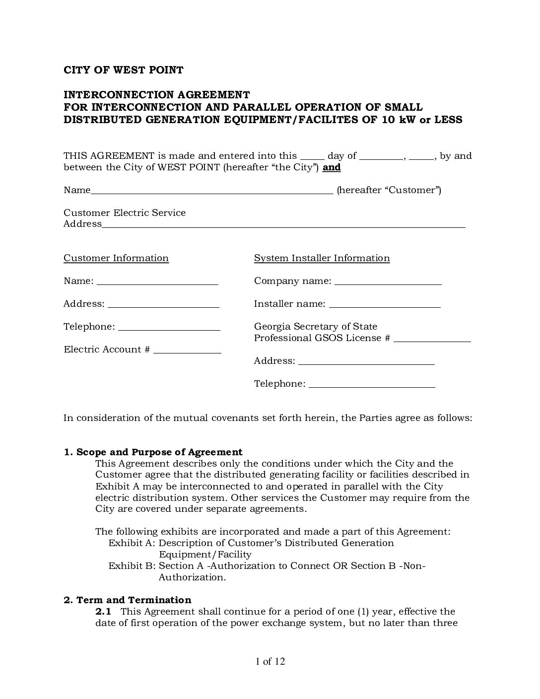 View Larger Image Interconnection Agreement DG West Point 10kW Final Download File Type: pdf File Size: 113 KB Categories: Distributed Generation (Solar) Rate Tariff and Agreement By Gauge Bailey|2026-03-09T15:32:51+00:00March 9, 2026|Comments Off on Interconnection Agreement DG West Point 10kW Final